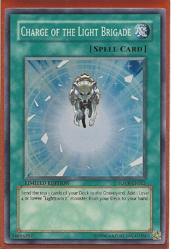 Charge of the Light Brigade Secret Rare Card Description: Attribute: Normal Spell Text: Send the top three cards of your deck to the graveyard. Add a level 4 or lower "Lightsworn" monster from your deck to your hand.